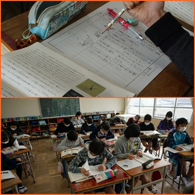 国語の時間に説明文『自然に学ぶ暮らし』を読解しています。今日は、「まとまりごとに筆者の挙げる事例をまとめよう」というめあてのもと、文中に表されている自然の仕組みをまとめました。