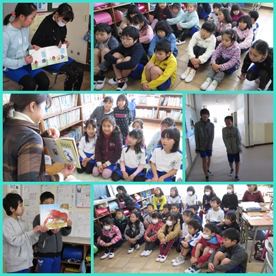 昼休みの時間には、司書の先生の読み聞かせです。今日も低学年が集まりました。「さる みる」「さる ねる」など、リズムのよい言葉に、みんなにこにこしながら聞いていました。