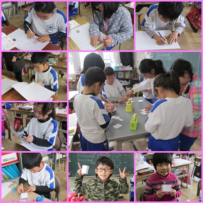 今日は,調べたことを生かし,工作用紙を使って面を切り取り,テープでつなぎ合わせて「はこの形」を組み立てました。