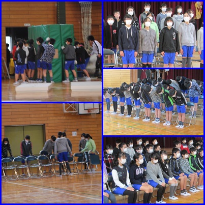 朝会が終わると,演台の設置や椅子並べをしてから練習開始。今日は,立ち方,座り方,礼の仕方などを練習しました。