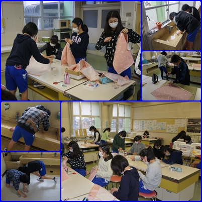 女子は家庭科室でコンピュータカバーを作りました。山名小学校には各教室にコンピュータが設置されています。そのコンピュータにほこりがかからないように、布でカバーを作りました。ミシンの扱いも手慣れたものです。