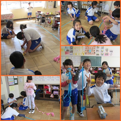 最後の方になると,テープの長さが足りなくなり,さまざまな色のテープをつないで作っているグループもありました。