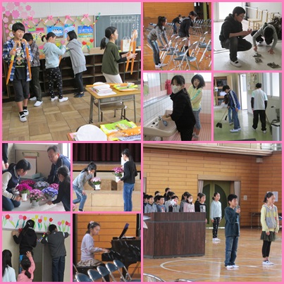 体育館や教室,トイレなどの掃除,式場設営,教室の飾り付けや教科書などの配布。とても一生懸命に活動していました。