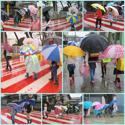 昨日入学したばかりの1年生も傘を差し,お兄さん・お姉さんの後について1列に並んで,全員元気に登校してきました。