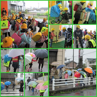 合羽を着せたり,迷子にならないように手をつないで移動したりと,登校時と同様に1年生に優しく接する高学年の姿が見られました。