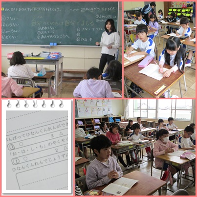 約束が守れたか,よくできたことは何かなど,学年に応じて振り返り,防災ガイドブックに記録しました。