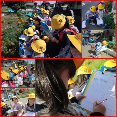ムスカリやスイセンなどの春の草花や、交通標識や防火水槽などの、地域安全に関わるものを探すことができました。学習カードにはたっぷりと絵と発見したものの様子が書かれていました。