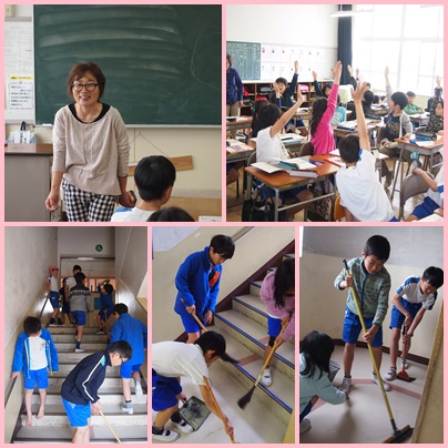 (下3枚)避難訓練振り返りの後、砂や土で汚れた廊下や階段を掃除する姿がありました。高学年として全校のために何ができるかを考え、素晴らしい行動でした。終わった後は自然と清々しい表情になっていたのが印象的でした。
