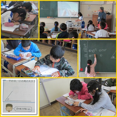 皆やけに顔が机に近づいていると思ったら,分度器で角の大きさをはかっているところでした。分度器の中心を頂点に合わせ,分度器がずれないようにしっかり押さえながら細かい目盛りを読んでいるのです。
