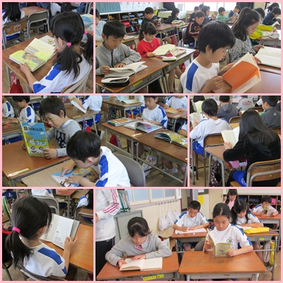 昨日図書館で絵本を借りた1年生。今日は一人一人絵本を読んでいます。文字を指でたどったり,一文字一文字目で追ったりしながら,声に出して読んでいました。文字を覚えたての1年生。読みながら自然に声が出てしまうのです。一生懸命に読んでいる姿がかわいい1年生でした。
