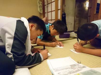 1日目のまとめ。家族への手紙を書いています。真剣な表情です。