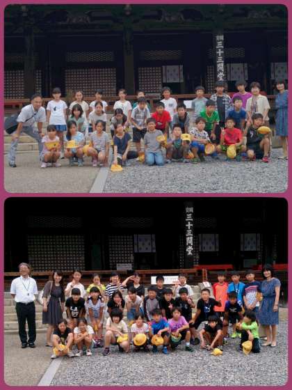 三十三間堂見学。中は撮影禁止です。会いたい人に似ている像を探しながら見学し、その後、通し矢の痕を探して庭を歩きました。