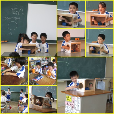 持ってきた容器を使って、いろいろな形があることを学習した1年生。