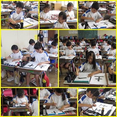 今日は「縦画」の筆使いを理解し,字形を整えて書くことができるのを目標に,「土」の練習です。始筆・送筆・終筆に気をつけて,集中して書きました。