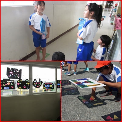 図工の時間に製作した、「光のプレゼント」の作品を、みんなで鑑賞したり、運動場で太陽の光を通して遊んだりしました。