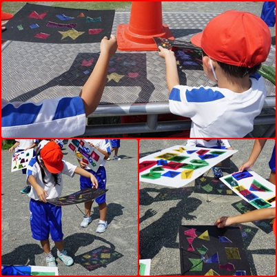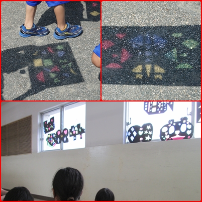 光を通して廊下や地面に映る形に、子ども達からは「わー!きれーい!」などの声が上がっていました。
