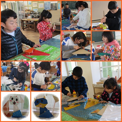 ギコギコとのこぎりで切り分ける作業は終わり,今は,色を塗ったり,トントンと板と木切れを打ち付けたり,接着剤でつけたりして組み立てています。
