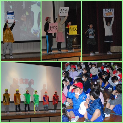 1月24日〜30日の全国学校給食週間に合わせて、給食委員会が児童集会で給食についての発表をしました。