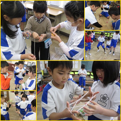 今日は、教室でこまとあやとりに挑戦!