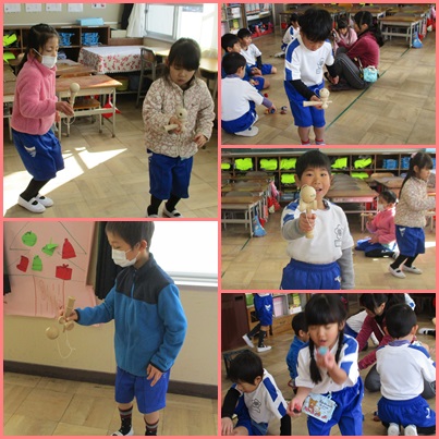 授業参観で,祖父母から昔の遊びを教えてもらった1年生。