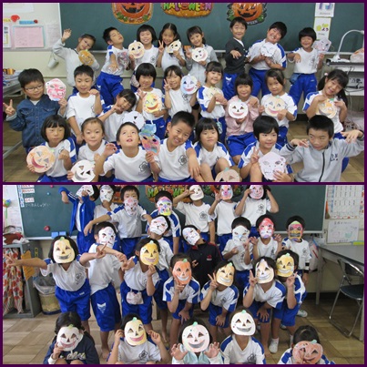 その後、モンスターのお面に色を塗り、みんなで記念写真!休み時間もモンスターになりきって、1、2組混ざって楽しく遊んでいました。