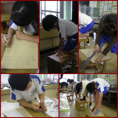 板を切って組み合わせ、小物入れを作ります。今日は、設計図にしたがって板に線をかき、のこぎりで切ったり、やすりで磨いたりしました。初めてのこぎりを使う子が多く、悪戦苦闘、真剣な顔で取り組んでいました。しかし、切り終わるとにっこり、「楽しかった。」続きが楽しみです。