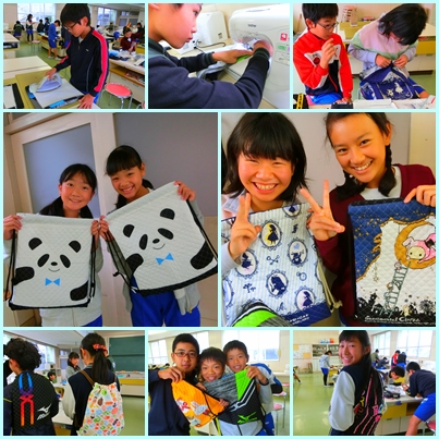アイロンやミシンに苦戦したり、ひもを通すのに苦労したりしながらも、がんばって作ったナップザック。