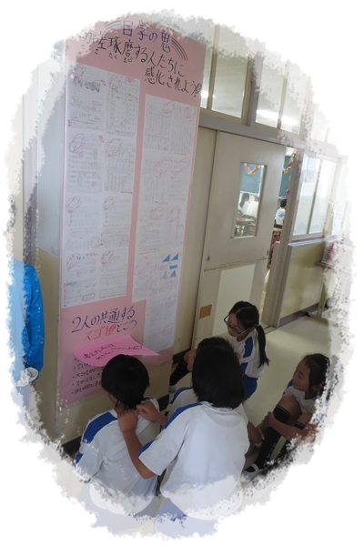 自学の取り組み方を紹介している掲示物に,多くの子が集まります。