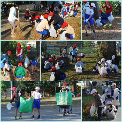 今日から落ち葉拾い月間のスタートです。毎週火、金の朝、全校で落ち葉を拾います。今日は初日ということもあって、たくさん落ち葉がありました。一人ずつ袋を持って拾い集めていました。