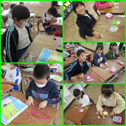 1組では、かぞえ棒を使って、2組では、色板を使って、いろいろな形を作りました。