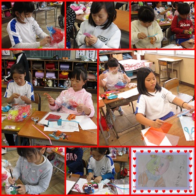 透明の袋の組み合わせや中に入れる紙の色の組み合わせを工夫し,どんな形の友達を作るか考えました。