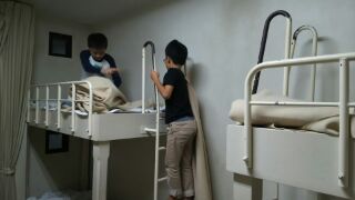 部屋の中では、協力してシーツを敷いています。(素晴らしい!)