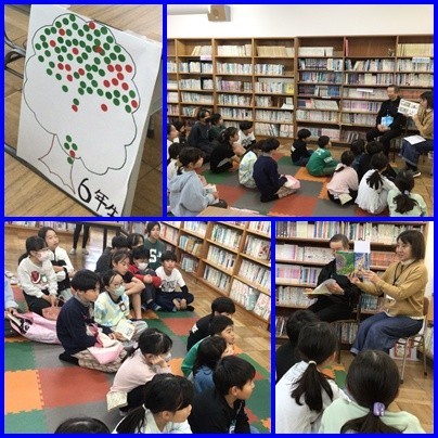 今日の昼放課に、司書さんと先生による読み聞かせがあり、1~6年生が図書室に集まりました。