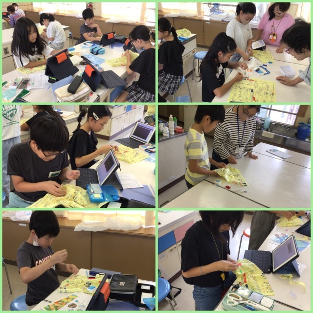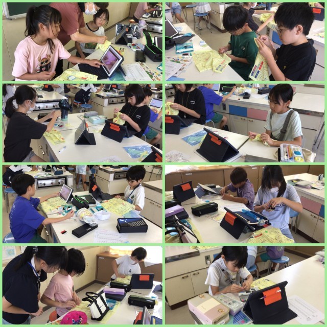 裁縫の授業をしています。今日は、のびっ子育成隊の方からのアドバイスや動画を参考にしながら、波ぬいやボタン付けをしました。いろいろな縫い方があるため、作りたいものに合わせて選択できるようにしていきたいですね。