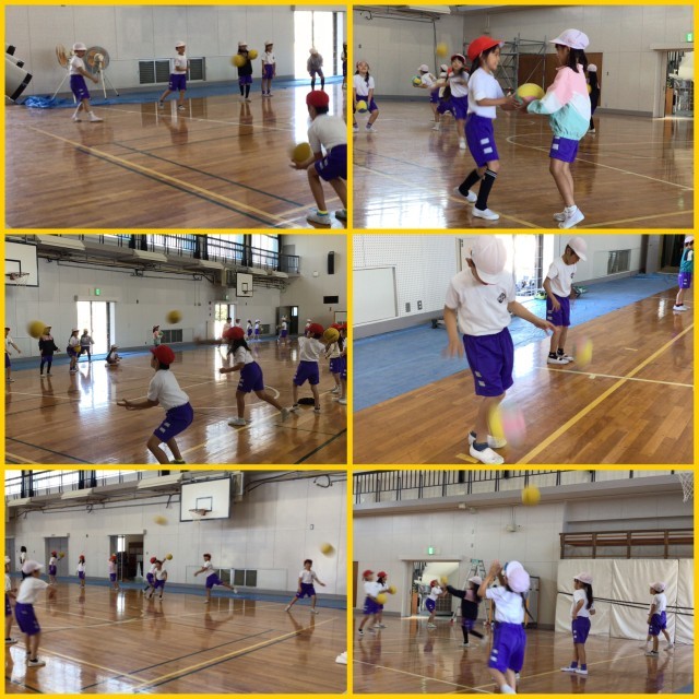 今日は、ボール運動をしました。ボールが落ちてくるまでに何回手を叩けるか、くるっと回ってキャッチできるか、ドリブル、ペアでキャッチボールなど、ボールを使って、さまざまな運動をしました。子どもたちは、とても楽しそうでした。