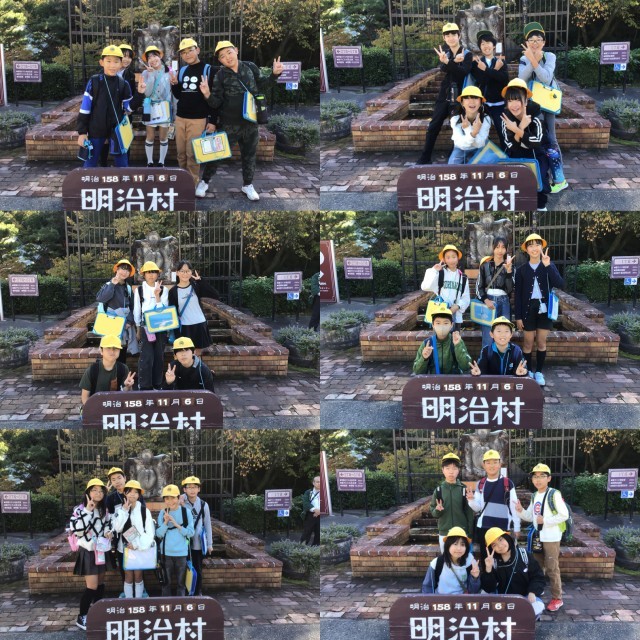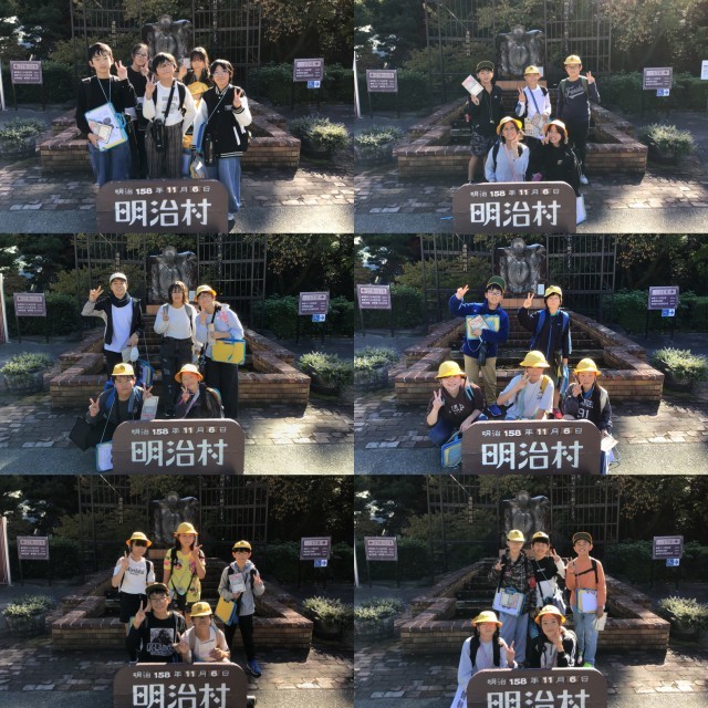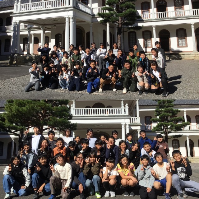 三重県庁舎前での学級写真と入り口モニュメントでのグループ写真です。