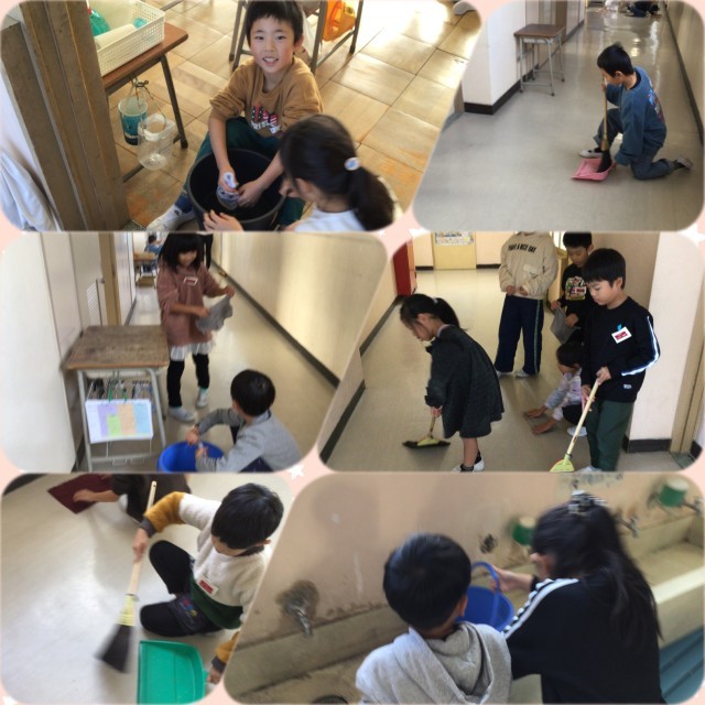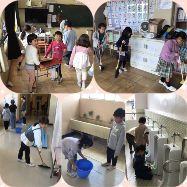 掃除の時間の様子です。どの子も隅々まで一生懸命掃除を頑張っています。初めは高学年のお兄さんお姉さんに教えてもらっていたことも、今では1年生だけで声をかけ合いながら完璧にこなすことができます。ぐんぐん成長中です!
