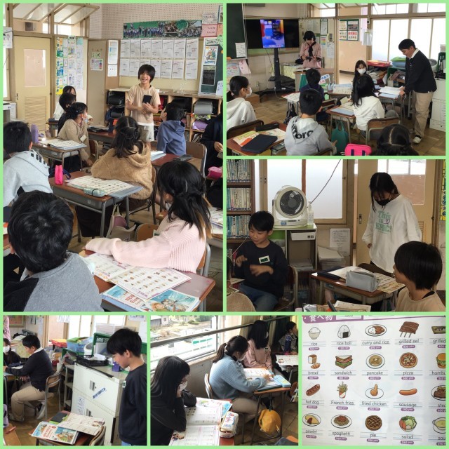 今日の外国語では、好きな食べ物と飲み物を英語で紹介しました。児童からは「ハンバーガーとコーラ」や「寿司とお茶」などいろいろな組み合わせがあり、盛り上がりました。