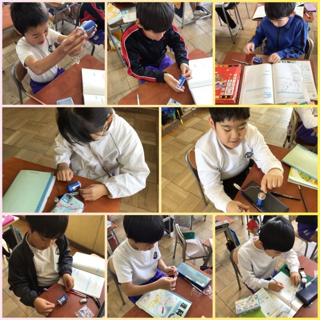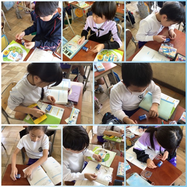 いろいろなつなぎ方で豆電球と乾電池をつないで、明かりがつくつなぎ方と明かりがつかないつなぎ方について調べ、ノートにまとめることができました。