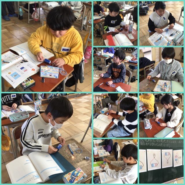 豆電球と乾電池をどのようにつなぐと明かりがつくか学習しました。