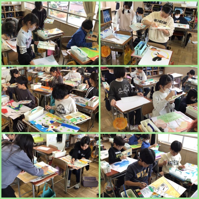 読書感想画「大造じいさんとガン」の色塗りをしています。それぞれ印象に残った場面に、思い思いの色を塗り、素敵な作品に仕上げています。