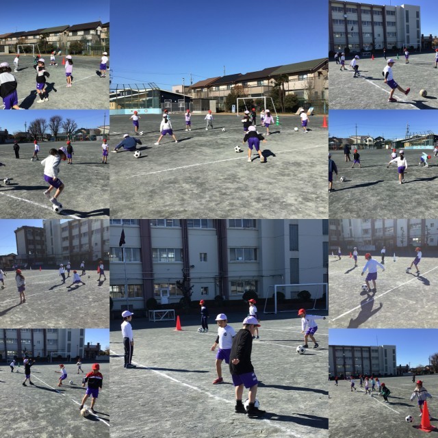 今日は、体育でサッカーをやりました。キックをしてペアにパスをしたり、パスされたボールを止めたりしました。足の間を狙って通す練習もしました。みんな一生懸命、楽しそうにおこなっていました。