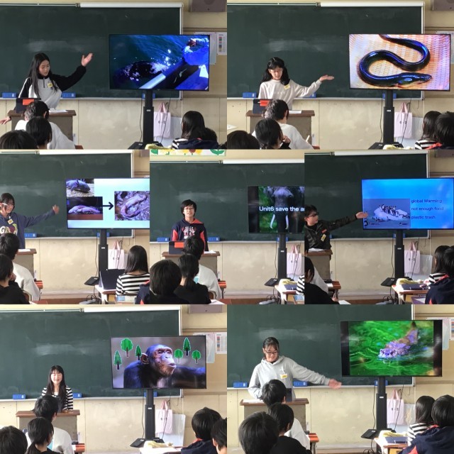 「地球温暖化」「森林伐採」「水質汚染」など、絶滅危惧種が直面している状況を英語で発表しました。