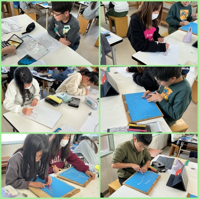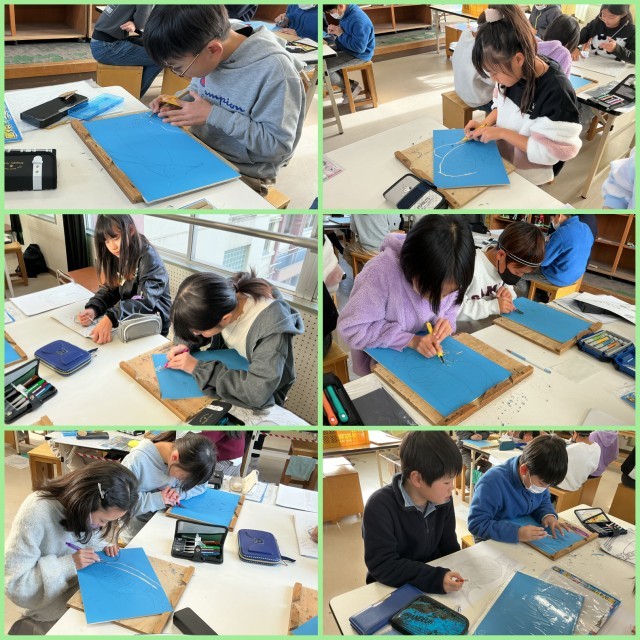図画工作では「木版画」に取り組んでいます。多くの児童が彫る作業に進みました。彫りたい箇所に合わせて、彫刻刀を使い分けて掘り進めました。