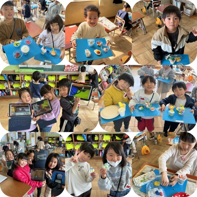 色の紙粘土を使って、ごちそうを作りました!!たくさんのごちそうが揃ったので、パーティーの始まりです!とっても美味しそうな作品ばかり。さらに、小さなキャラクター「スキマちゃん」も作り、色々な隙間に忍ばせた写真も撮りました。みんなニコニコです。