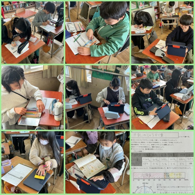割合のグラフのまとめをしています。好きな食材などについて、収穫量や生産額などをタブレットを使って調べ、表やグラフを使ってまとめ、分析しました。単元を通して、帯グラフや円グラフを使うことのよさについて考えることができました。