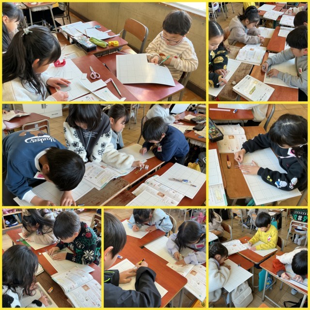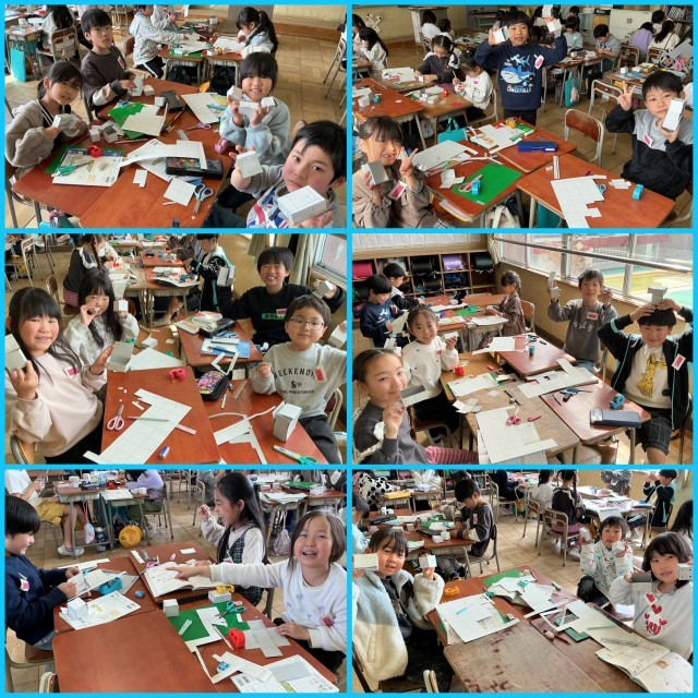 教科書に載っている2つの箱を作り終わった子から、自由に好きな大きさの箱を作る時間をあげると、みんなとても楽しそうに思い思いの箱を作っていました。楽しみながら、学べましたね!