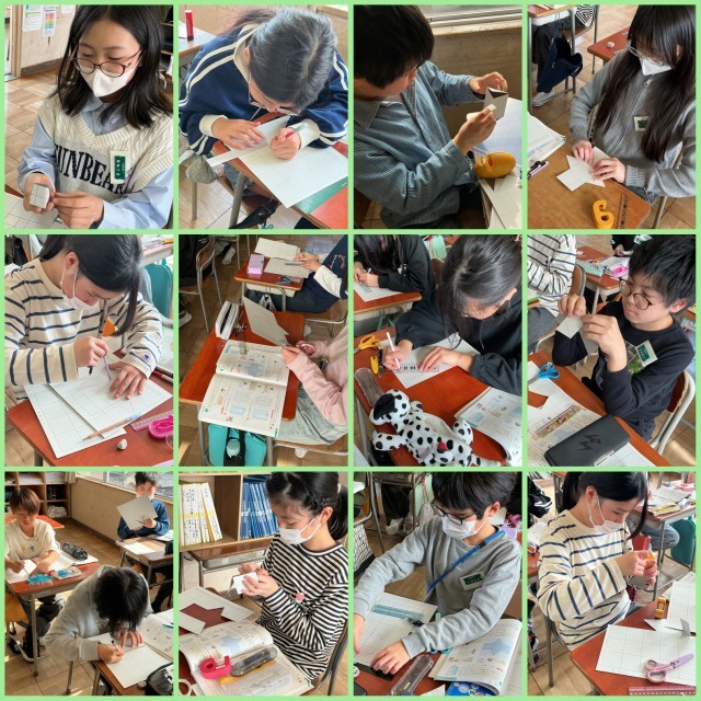 算数の授業では、方眼用紙を使って三角柱の展開図を書き、実際に組み立てました。底面と側面のくっつく辺がどこなのかを考えながら展開図を書いていました。
