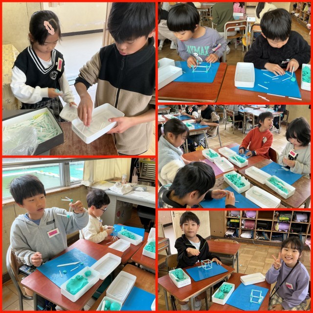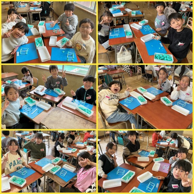 算数の学習で、ストローと粘土を使って、四角い箱の形を作りました。