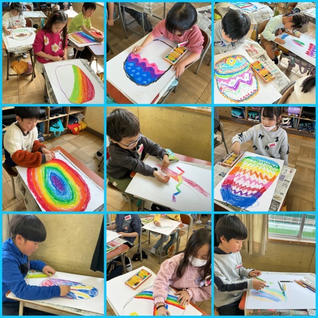 今日は、クレヨンでカラフルなたまごを描きました。